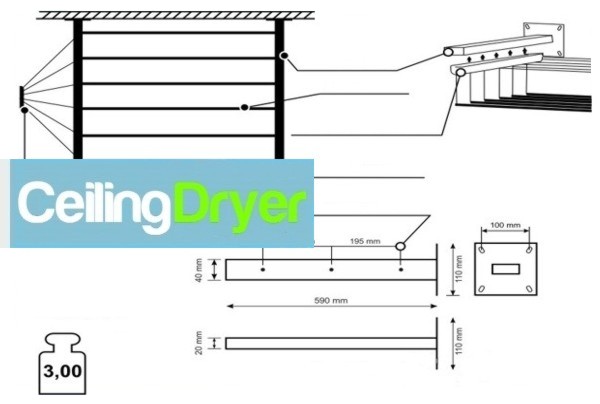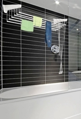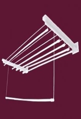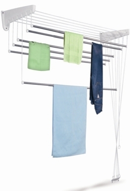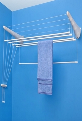 Wall Airer is a unique eco-friendly clothes drying system that mounts to the internal and external walls. It comprises of two consoles made from plastic that are attached to the wall and six individual plastic-coated rods with reinforced nylon cords. Each rod can be individually lowered and raised using a pulley system. Simply lower each rod and hang your wet clothes then raise each rod and let the fresh air finish off the drying. You can easily hang a full load of laundry without using any floor space at all. When not in use airer is completely out-of-the-way with no need to fold it or store it. It can be easily installed inside or outside and of course it can be attached to wood studs.